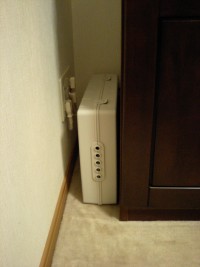 このケース、思いのほか収納力があります。ネットのモデムや電源ユニット、アダプター、OAタップといったものまで全部収納できてしまいました。これで送料も合わせて1000円ちょっとですんでしまったのですから、価格以上の価値が十分にあったと思います。サーバールームはお客さんの泊まる部屋にもしたいのでどうにかしたかったのですが、ようやくまともに使える部屋になりました。