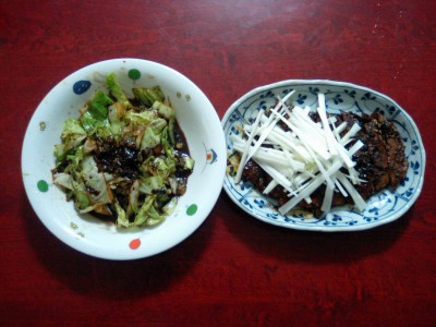 鶏の照り焼き風と、その漬け汁を使ったキャベツのホイコーロー風です。