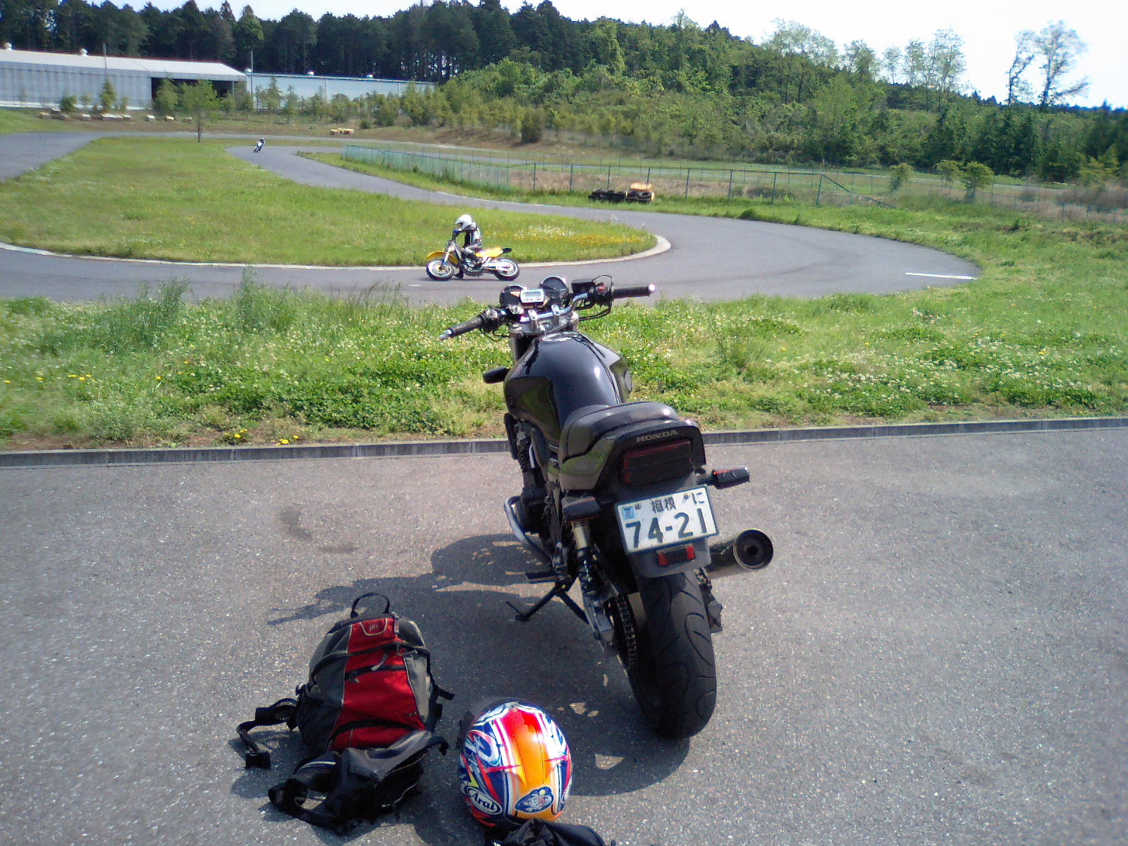 バイクをセットアップしていると、モタードの人が早くもコースイン。ストレートの加速の音を聴いていると、もういても立ってもいられません。私も速やかにコースインします。まずは、タイヤを暖めるつもりでゆっくりと3速で周回します。でも、第一コーナーはものすごいスピードで近づいてきます。いきなり第一コーナーで大きくはらみます。「こ、こえぇ~・・・」 強烈なGとストリートとは違うスピード感。どうやらサーキットの走り方をすっかり忘れてしまったみたいです。気を取り直して、続くヘアピンへ。やっとの思いで膝を出します。でも、やっぱりラインがはらみます。う~ん・・・、どうもおかしい。どうやって走ったっけ? ペースを落として何周か回るとなんとなく前回の感触が戻ってきたような気がします。すこし余裕が出てきたような感じがしたのでP-LAPの表示をちらっと見ると、「え!?36秒台?」 遅すぎます・・・。その後も周回を重ねますがラップタイムは上がらず、20周ぐらいからやっと34秒台が出始めましたが、結構自分ではがんばってるつもりなのに、何周走ってもタイムは上がりません。おかしい。前回の梨本塾の時よりも2秒も遅いのです。とりあえず冷静になろうとピットへ。「あちい~。」 バイクを止めてヘルメットを脱ぐと、さーっと流れる心地よい風。「きもちいい~。」 とりあえず受付小屋の自販機でエビアンを買ってきて半分ほど一気に飲み干しました。気がつくといつの間にかカワサキの人たちもコースに出ています。カワサキグリーンのヘルメットの人がいい音をさせて走っているので、しばらくうまい人の走り方を観察してみることにしました。やっぱりラインが安定していて、いつも同じところを走っていきます。ネーキッドのバイクでハンドルが高いせいかそれほど体は中に入っていないものの、頭も体も進行方向を向いています。思い起こすとさっきまでの自分はコーナーに差し掛かったときの目線がかなり近いところを見ていたと思う。ポイントはやっぱり目線にあって、これを修正するにはかなり強く意識しないといけないようだ。意識的に目線のみならず、頭ごとコーナーの先の立ち上がりのストレートに向けるぐらいの意識でよいのかもしれない。公道でもこのようにするとコーナリングが安定して安心感をもってコーナーを曲がれるような気がしていたことを思い出す。きっと恐怖心があって、バイクを十分に信用しきれていないから、思わずコーナーの近いところに目線が行ってしまうのかもしれない。次はコーナーの前では十分に減速して、恐怖心を感じないレベルまでスピードを落としてから、頭ごと進行方向のその先に向けるぐらいのつもりで曲がるというぐらいのつもりで走ってみよう。20分ほど休憩したあと再びコースイン。まずはまたタイヤを暖めるつもりで、でも、ストレートでブレーキングを始める時から目線と頭をしっかりと意識してコーナーの向こう側に向けます。お、いい感じでコーナーのイン側にバイクが入って行きます。やっぱりこれだ。次のヘアピンでも同じように頭を意識して向けるとやはりバイクがすっとコーナーのイン側に入っていきます。続く左コーナー前でもしっかり減速。あ、ちょっと左はヘアピンからの距離が余裕がないので膝を出そうとすると余裕がなくて、頭を先に向ける意識が追いつかなくなる感じ。ちょっとはらんだ。最終コーナーは、裏ストレートの後なので、頭をコーナーの先に向けるという意味では余裕がありそうだ。また頭を意識的に向けてコーナリング。お、再びいい感じ。35周目には33秒台、43周目以降には32秒台がコンスタントにでるようになった。ここで、またタイムが伸びなくなってきたので、再びピットイン。